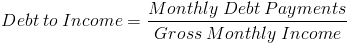 The formula for the debt to income ratio is the applicant's monthly debt payments divided by his or her gross monthly income.