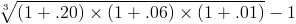 Using the formula for compound interest with different rates, the ending balance after year three can be found by multiplying the balance times 1.20, 1.06, and 1.01. The ending balance after year three would be $1284.72. Notice the differences between the ending balance with incorrectly using the arithmetic mean shown in the prior paragraph and the actual ending balance.